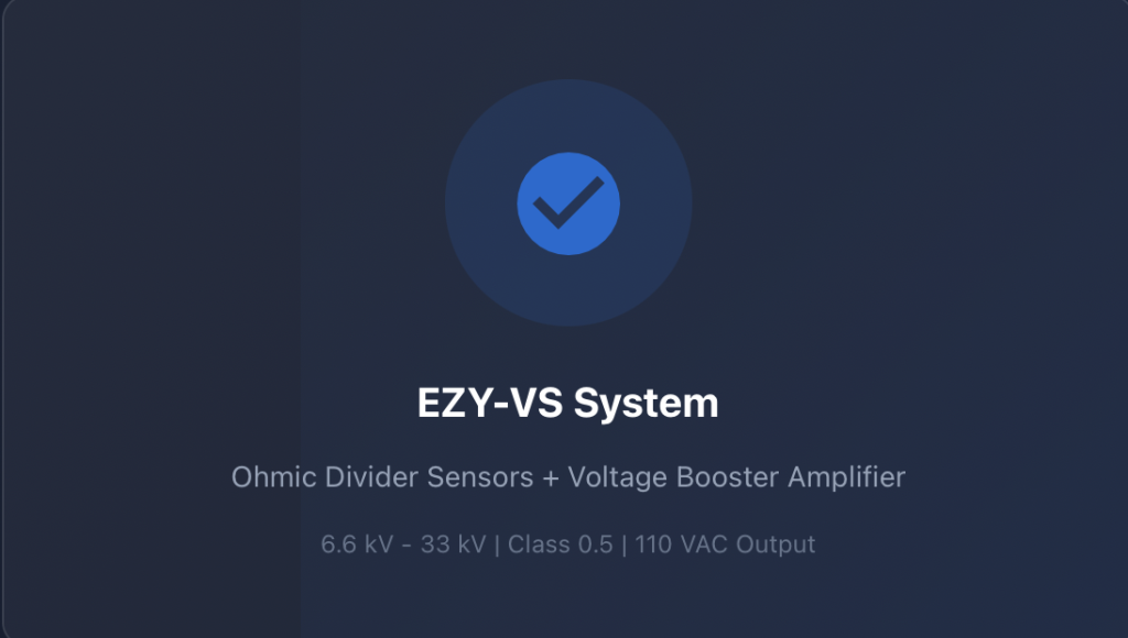 The EZY-VS is a two-component voltage measurement system consisting of compact ohmic divider sensors and a precision booster amplifier. It replaces conventional electromagnetic voltage transformers (VTs/PTs) in medium voltage switchgear by using resistive voltage division instead of electromagnetic transformation. The sensors weigh just 0.75 kg (compared to 15-30 kg for a conventional VT) and produce a standard 110 VAC output suitable for protection, metering, and synchronization equipment.
