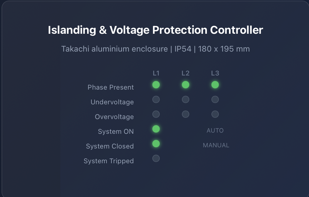 Automated grid isolation for medium voltage embedded generation. Detects under-voltage, over-voltage, and phase loss — then physically disconnects your installation within milliseconds.